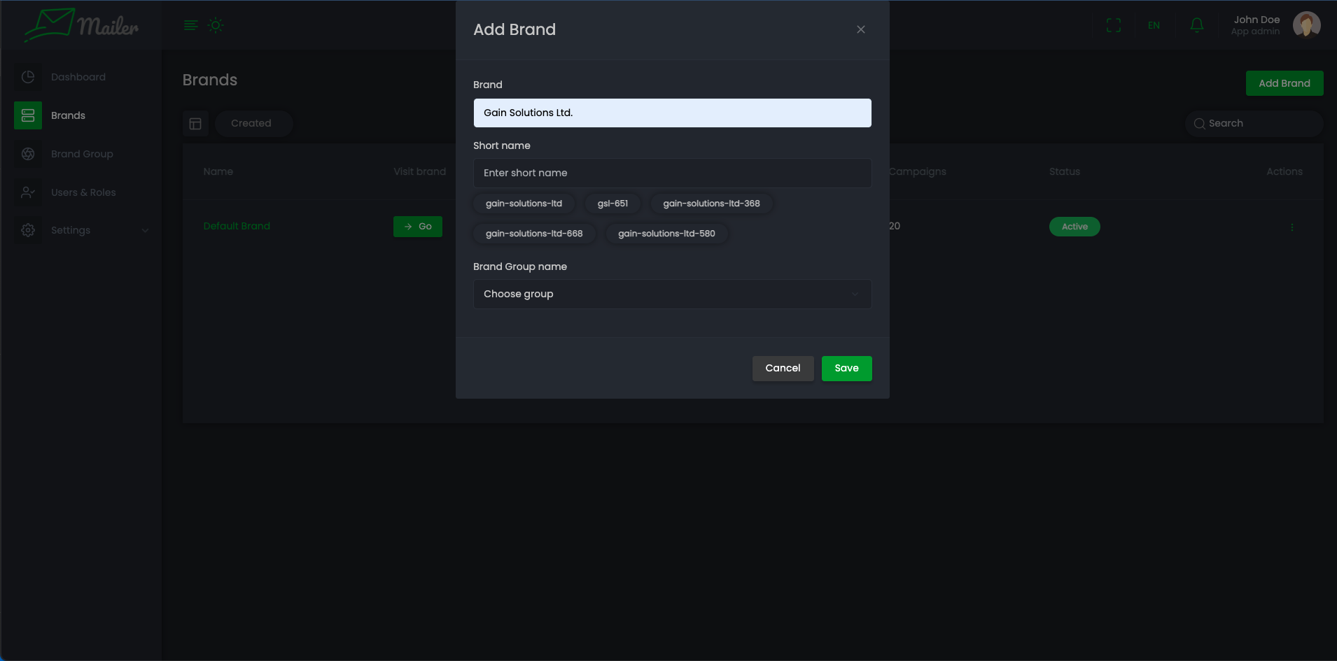 You can create a new brand. Type a name of brand on name text box. It will recommend some brand's unique short name. Select a short name or change the way you want. One a Brand is been created you can't change the short_name.