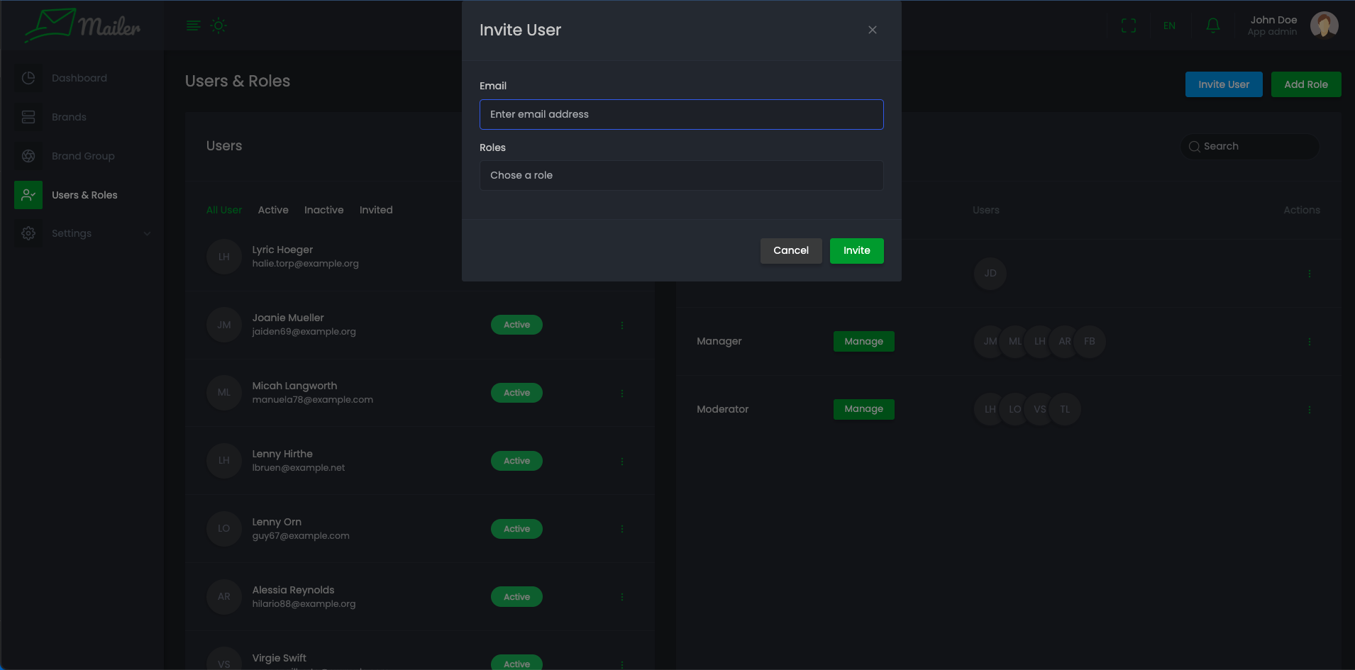 Click on Invite User, It will open a modal that requires user email, and role that will assigned to that user. Invited user will get an confirmation email with a link. That link will redirect to a page where user can set their basic information.