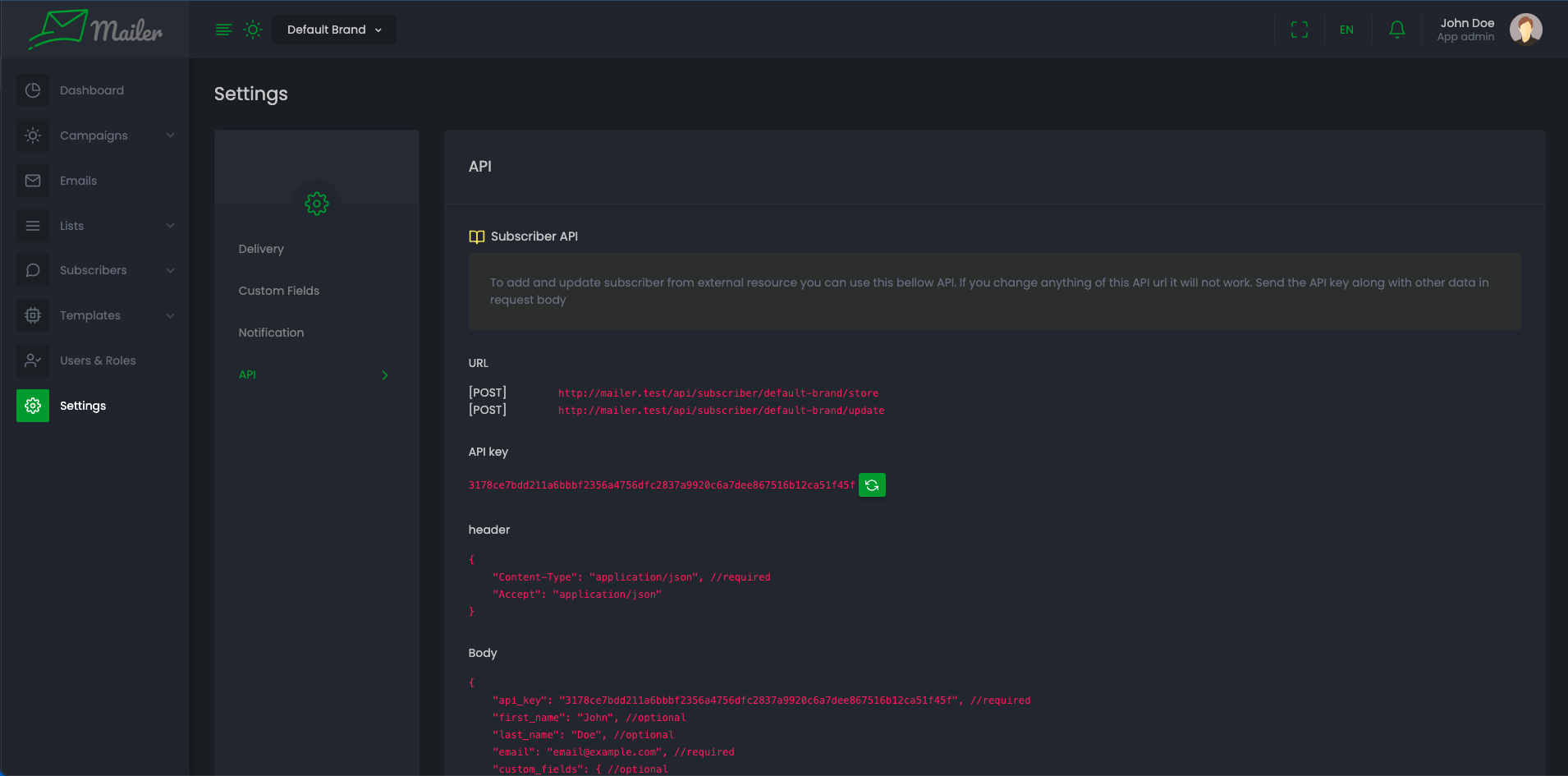 Go to "Settings" > "Api": You will find the api URL, Header and Body to add subscriber from external resources like, Postman, Insomnia or any client side Application.