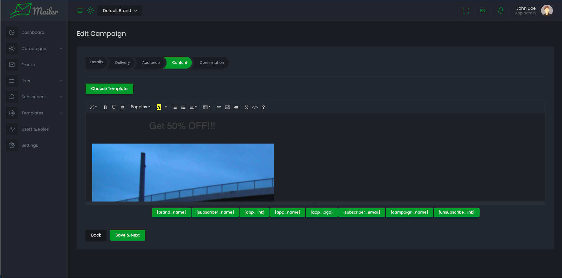 When updating template to insert tag into template you have to click on the tag to insert. But for something like url or image you have add them from editor menu. From above screenshot if you want to add the {unsubscribe_link} tag to the template. Click on the link option and add it in second input. Add your link header in first input. For {app_logo}, Click on picture from editor menu and add this to the input box. One nice little feature is you can have autocomplete for tag inside editor. Start typing tag name and it will give you autocomplete. Example: {brand