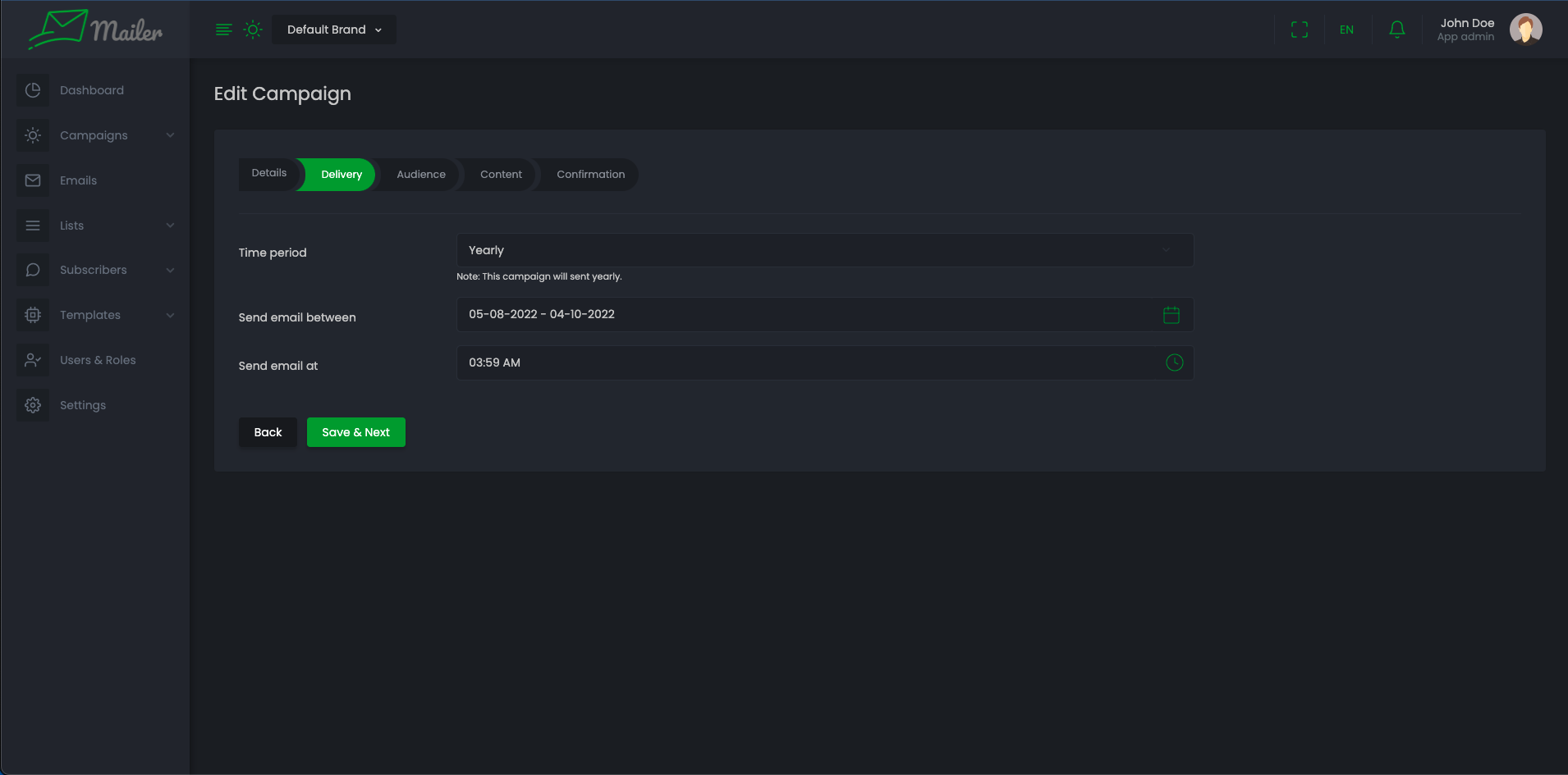 Fill campaign name, Email Subject and campaign attachments and click "Save and Next"