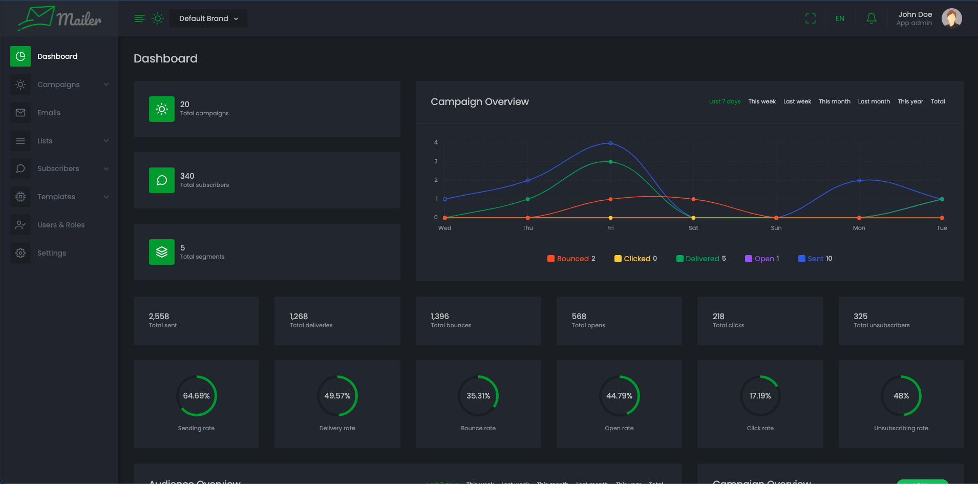 You can see brand's Total sent emails count, Total deliveries count, Total bounces count, Total open count, Total clicks count, Total subscribers and unsubscribes count.
