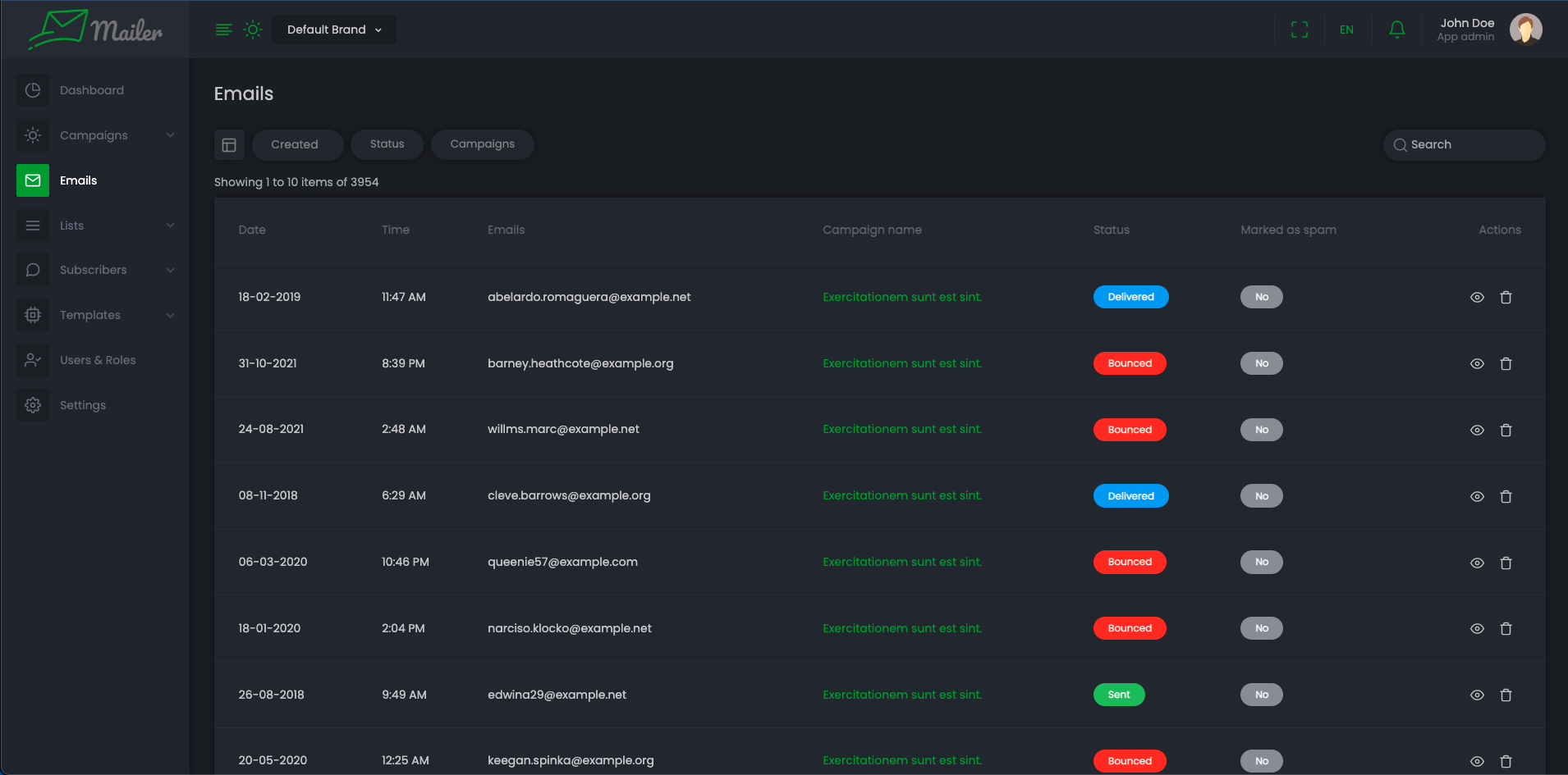You can see Total sent emails count, Total deliveries count, Total bounces count, Total open count, Total clicks count, Total subscribers and unsubscribes count. Which is based on all brands gross email logs statistics.