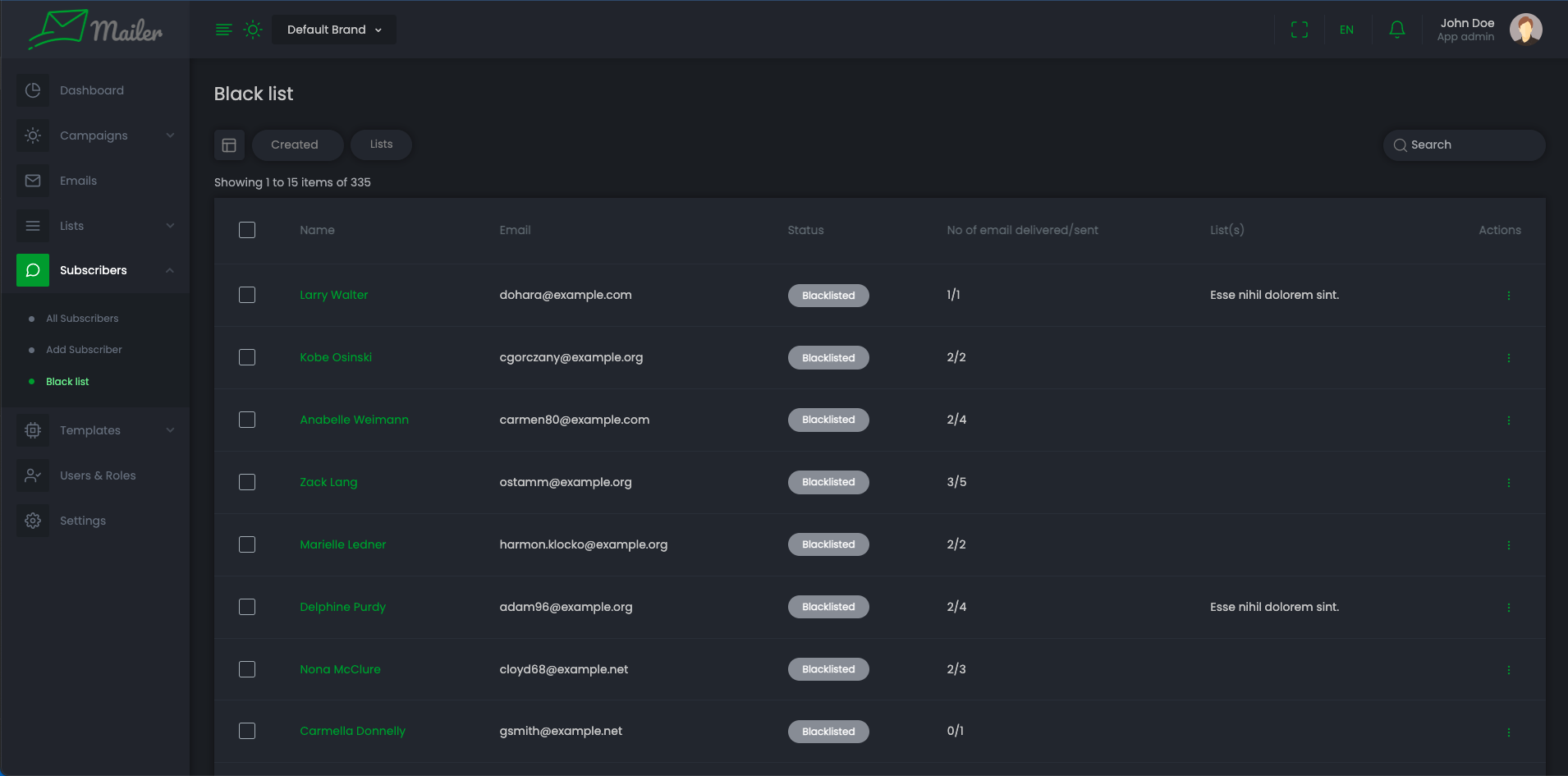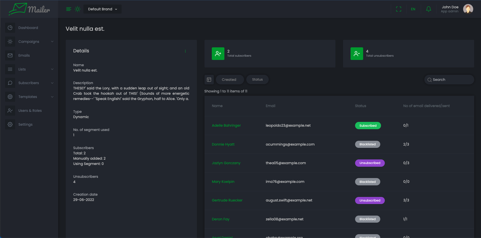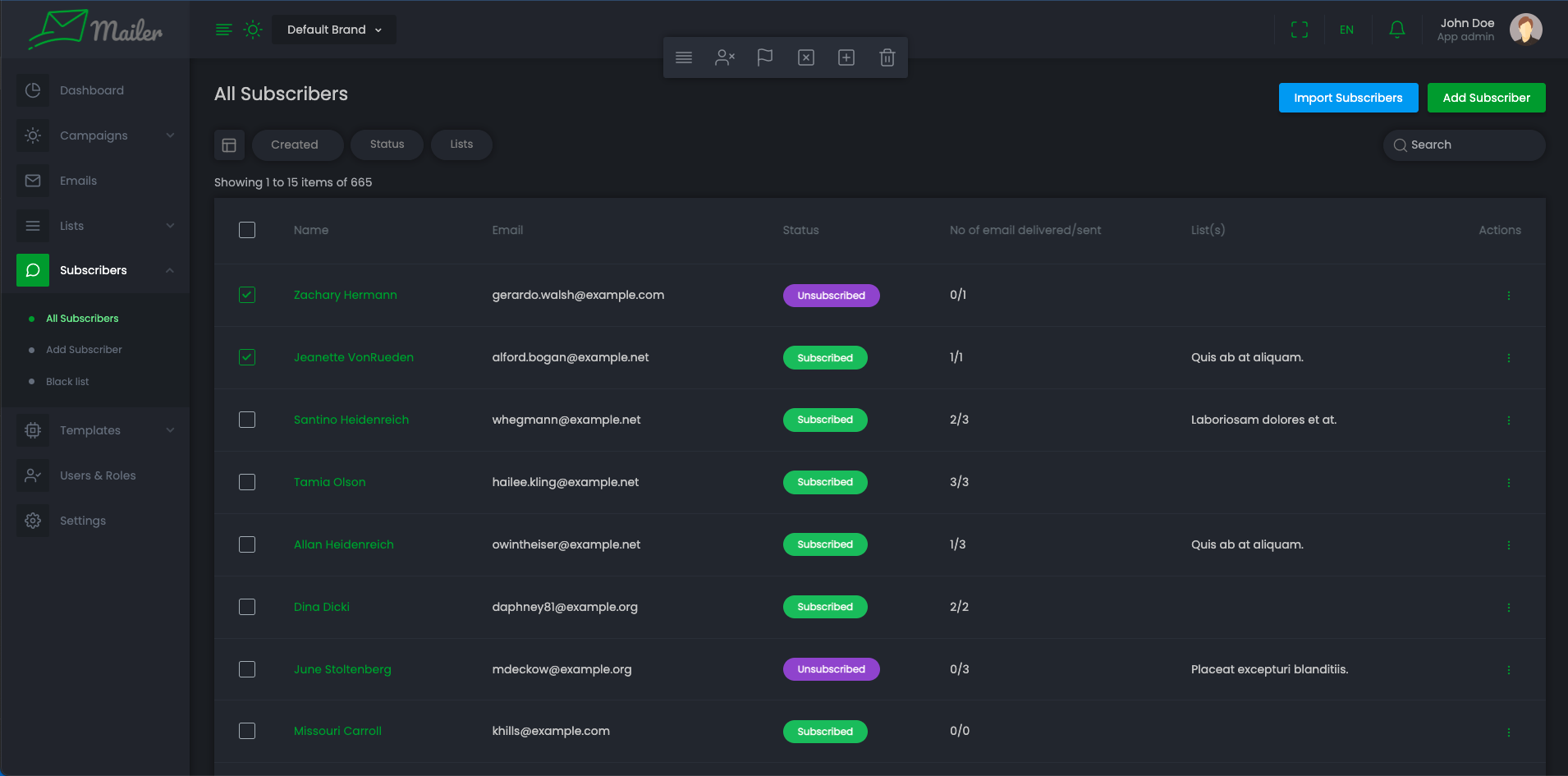Subscribers can be filtered with created date, current status, list which is assigned to subscribers. Also you can search subscribers.