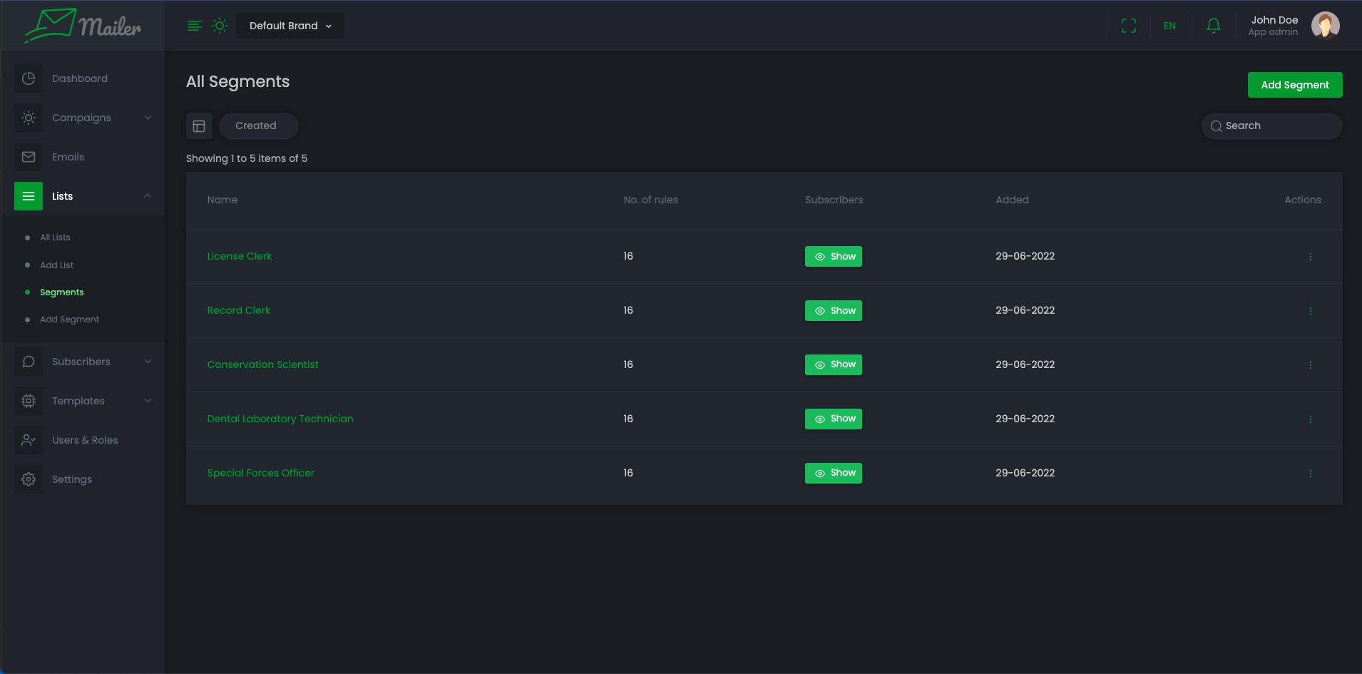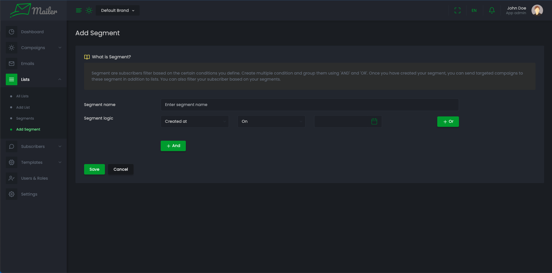 Go to "List" > "Add Segment". You can create a new segment. You must have to select at least one rule to create segment.