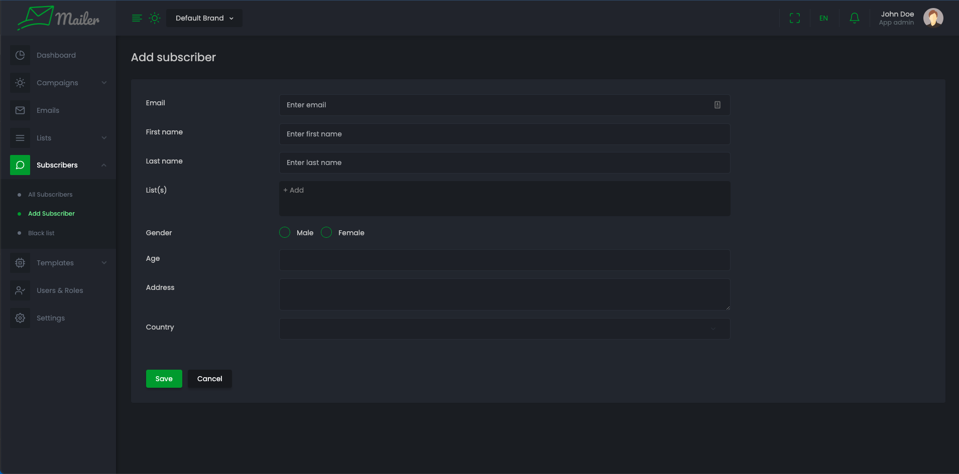 You can create a new subscribers. Click Add Subscriber. Fill at least subscriber email to create a new subscriber.
