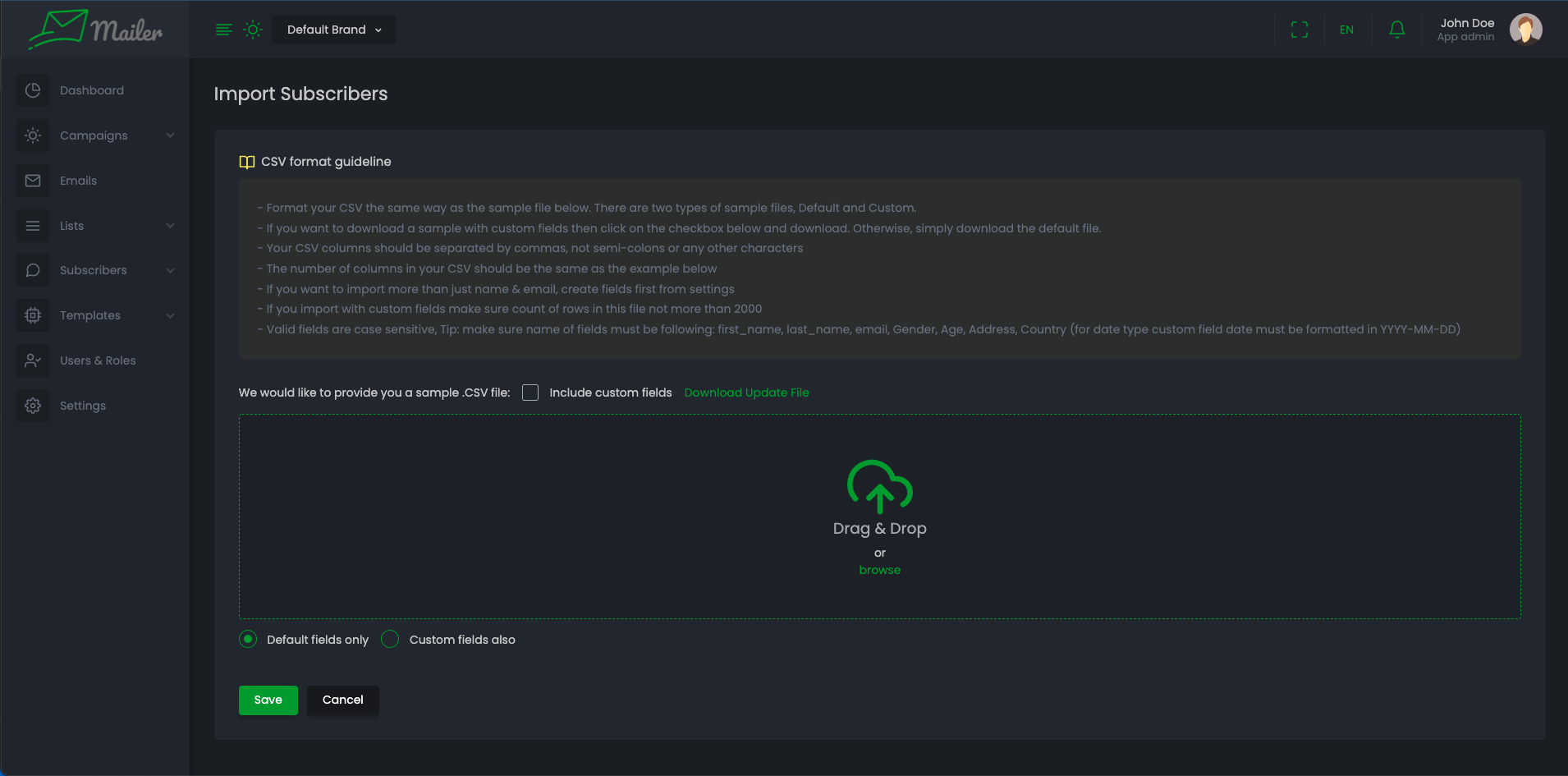 You can import subscribers through CSV file. Click Import Subscribers. Download a sample file. If you want to import subscribers with custom fields then check Include custom fields then click Download to download the file. Structure your csv in same structure of sample. And choose this file or drag and drop.