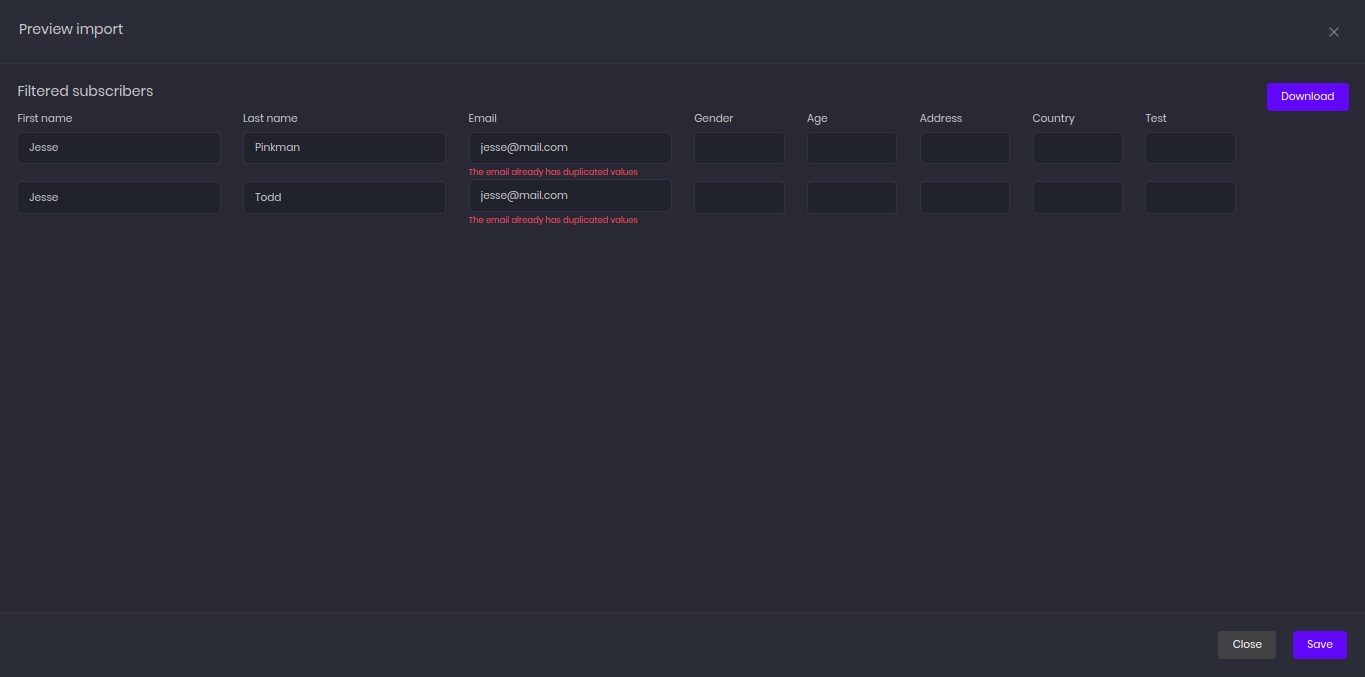 After submitting subscribers will imported into database, If some data has duplicate or missing value or with other issues will raise up within a modal where you can download the subscribers with issues.