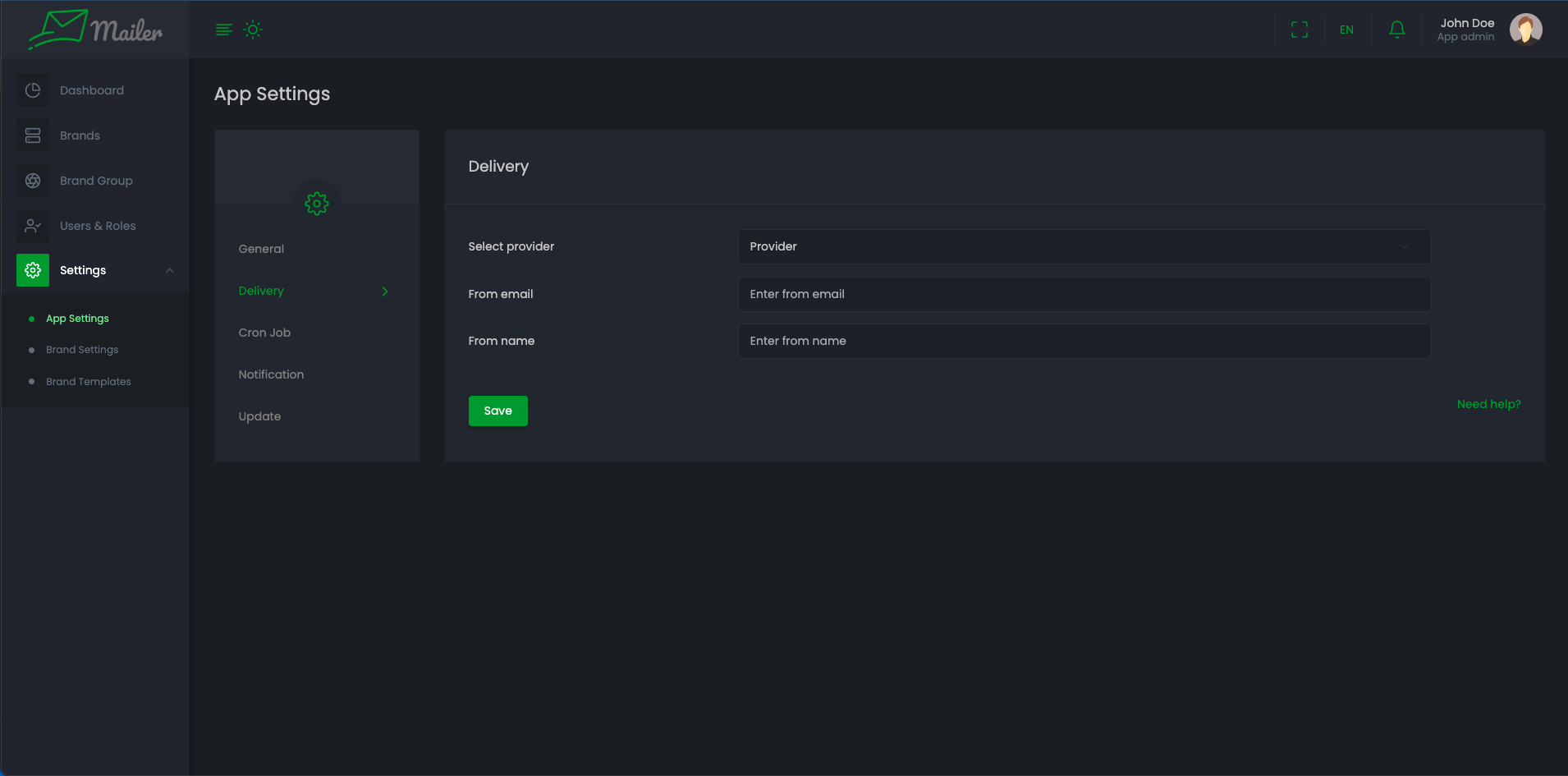 In app side brand settings section you can choose previously(From "Settings" > "App Settings" > "Delivery") added delivery settings and set that for all brand