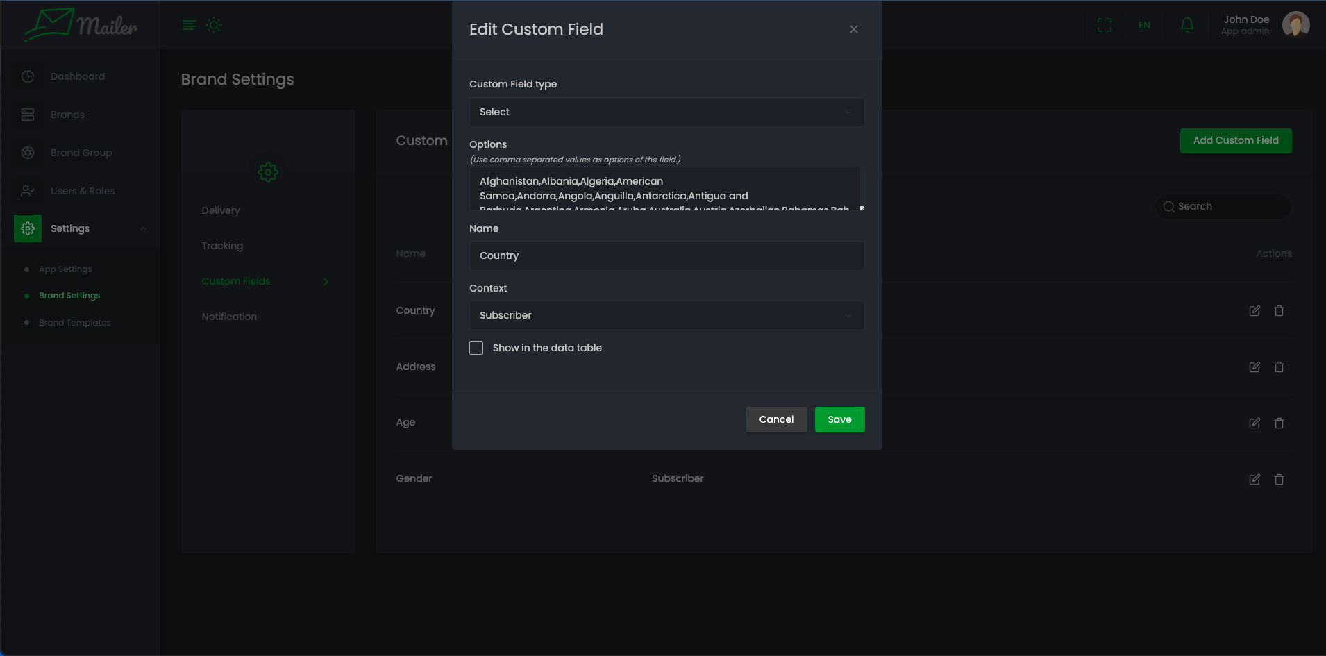 To create custom fields. click "Add Custom Fields" button, it will open a modal which reburies custom field type, name and context. If custom field type is 'radio/select' it will ask for options that will be shown as Selectable options.