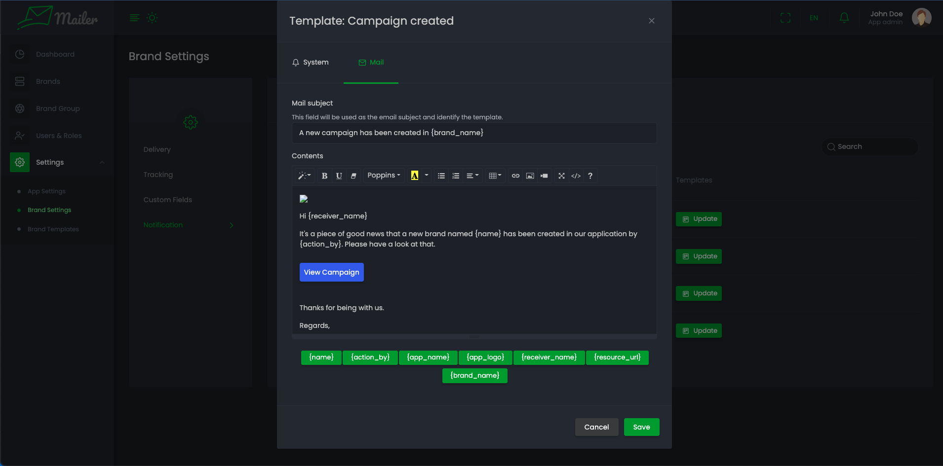 When updating template to insert tag into template you have to click on the tag to insert. But for something like url or image you have add them from editor menu. From above screenshot if you want to add the {resource_url} tag to the template. Click on the link option and add it in second input. Add your link header in first input. For {app_logo}, Click on picture from editor menu and add this to the input box